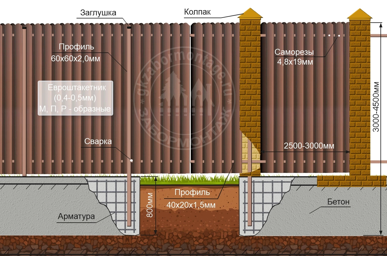 Конструкция забора из профлиста на ленточном фундаменте
